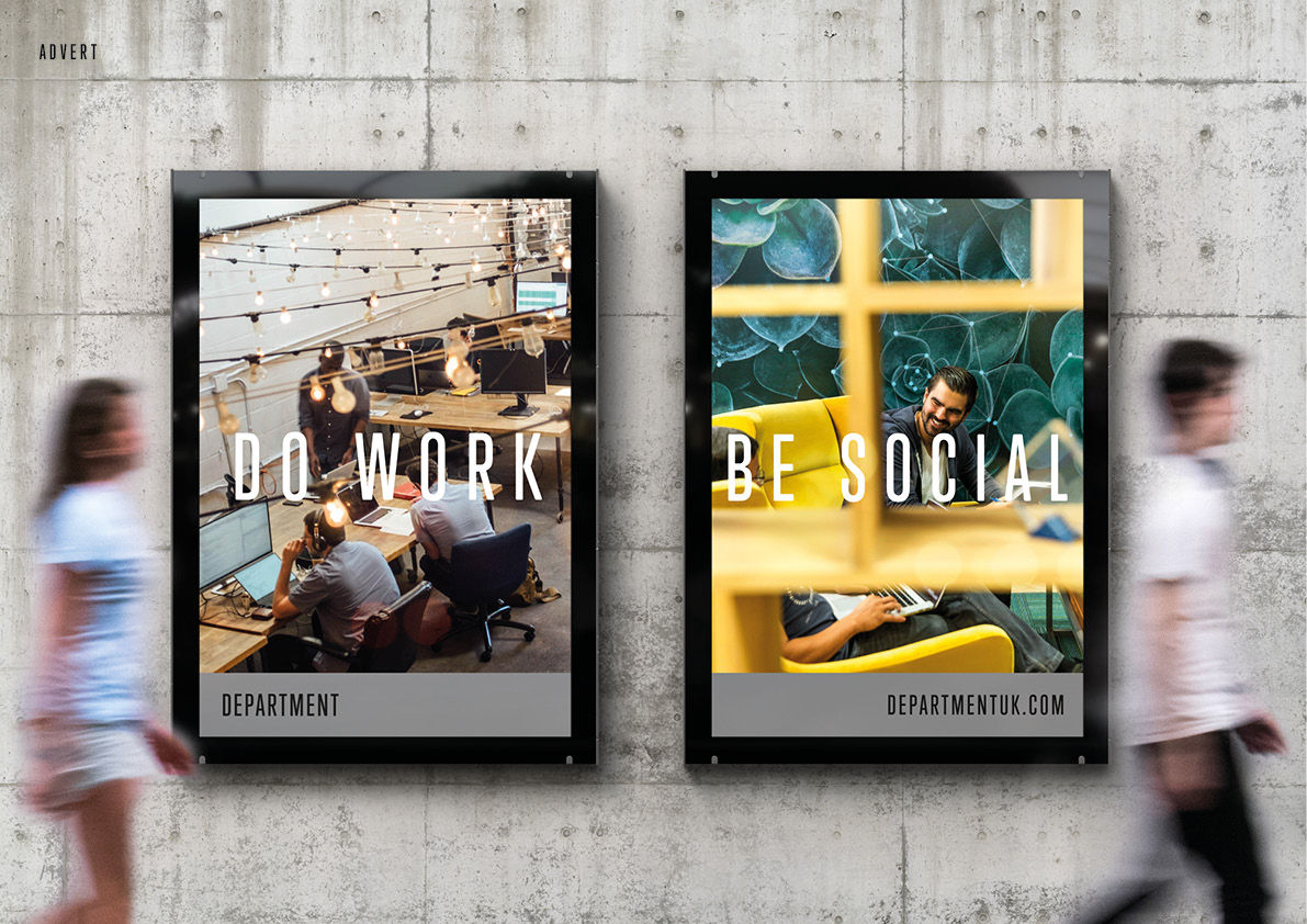 Department is a collection of co-working office spaces that is spread across Manchester. I was tasked with naming the offering and also giving it a comprehensive brand identity that would have the flexibility to be used across the wide variety of workspaces.